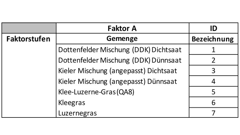 Ausbringen von 5 verschiedenen Ackerfutter-Mischungen als Blanksaat, wobei die kräuterreichen Mischungen in zwei unterschiedlichen Aussaatstärken gedrillt werden, um Auswirkungen auf die Etablierung der Kräuter untersuchen zu können.