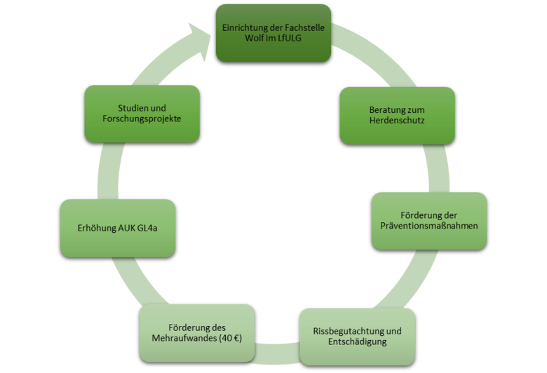 Im Jahr 2015 wurde das gesamte Territorium des Freistaates Sachsen zum Fördergebiet zum präventiven Herdenschutz gegen Wolfsübergriffe erklärt. Die Umsetzung des Mindestschutzes bildet die Grundlage für einen finanziellen Ausgleich im Schadensfall.