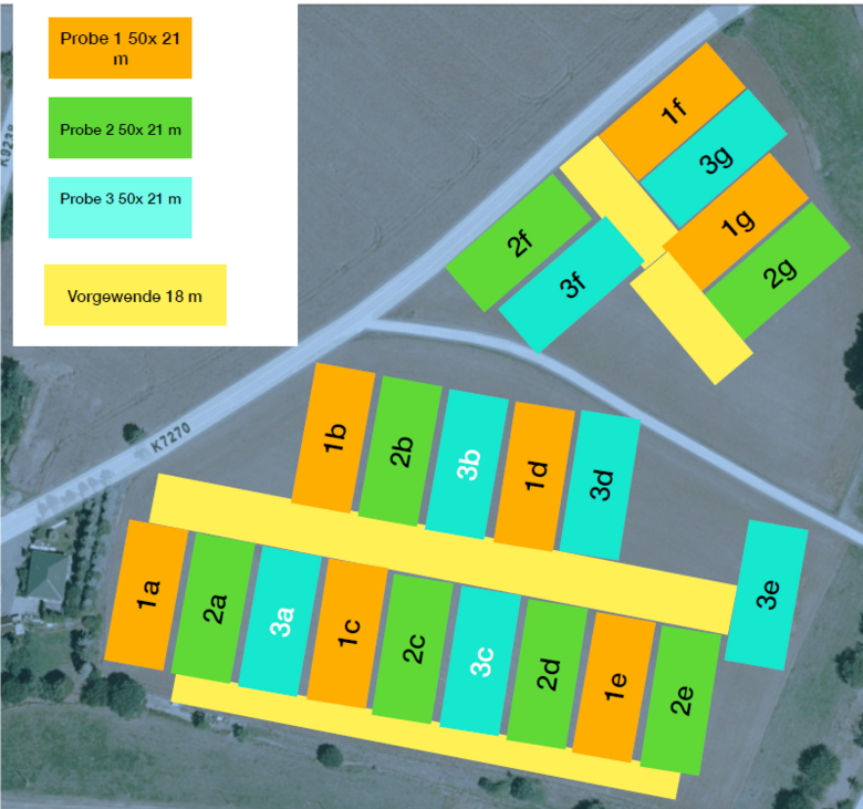 Die Wirksamkeit von PGPMs wurde in 3 Stufen (ohne PGPMs, niedrige Konzentration – Konz. 1, hohe Konzentration – Konz. 2) mit je 7 Parzellen untersucht (siehe Abbildung). Folgende Parameter wurden während der Vegetationszeit erfasst: Ertrag, Proteingehalt, Pflanzendichte, Wurzelanzahl, Stengelanzahl, Halmanzahl, Körnergewicht, Nährstoffgehalt, organische Bodensubstanz.