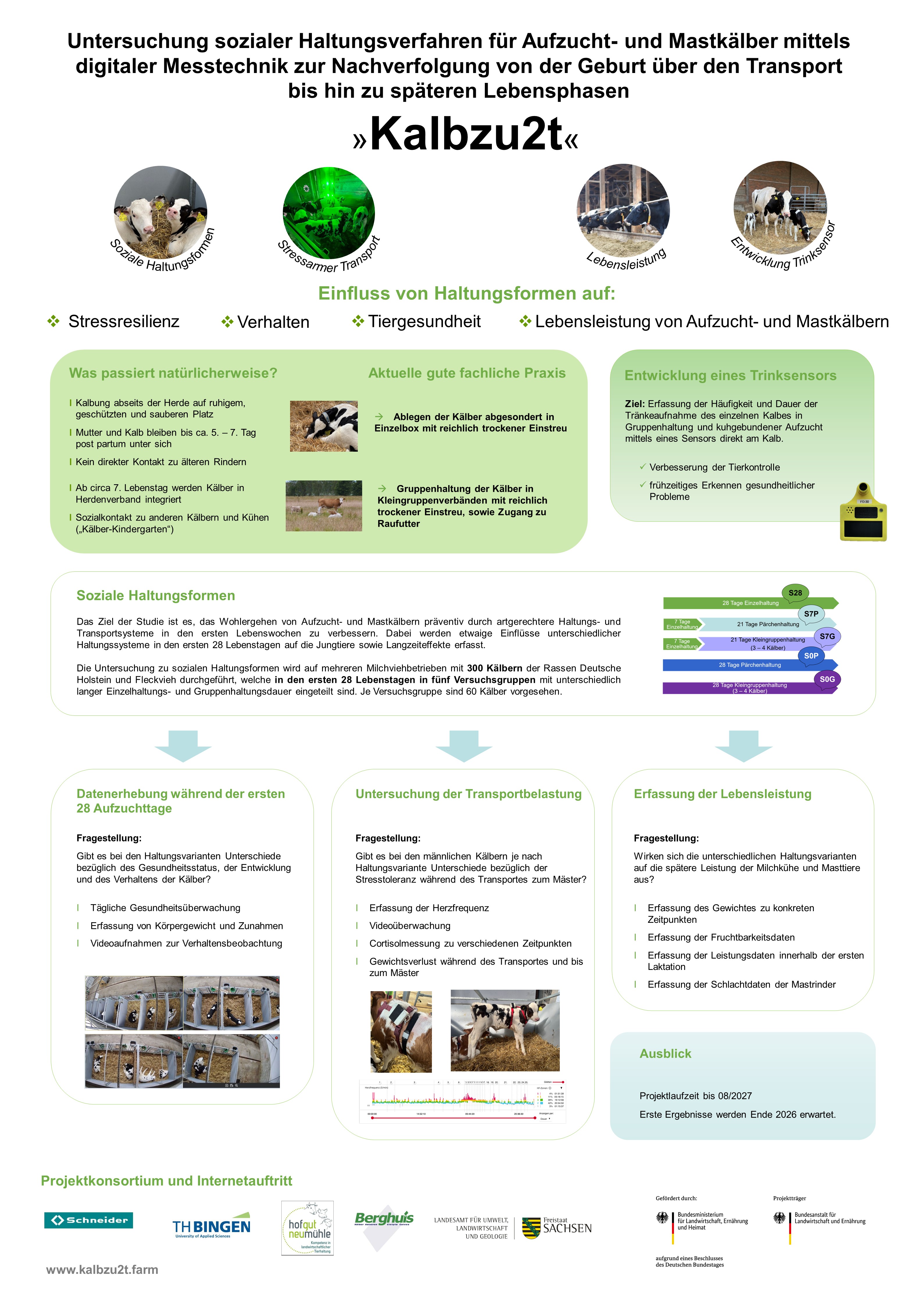 In einer vergleichenden Studie sind Haltungssysteme mit Einzel- und/oder Gruppenabkalbeboxen betrachtet worden. Anhand von Verhaltensbeobachtungen, Cortisol- und Estradiolgehalten im Blut, bakteriologischen Befunden, Gesundheits-, Fruchtbarkeits- und Leistungsparametern wurde der Effekt der unterschiedlichen Haltung zur Kalbung bewertet. Das Einzelhaltungsverfahren stellte sich für Kuh und Kalb als unproblematisch dar. Der direkte Vergleich der Abkalbung in Gruppe oder einzeln in einer Herde zeigte keinen Unterschied in den bewerteten Parametern. Die beim Einzelhaltungsverfahren höhere Kontrolldichte führte zu einer deutlichen Reduzierung von erkrankungsbedingten Kuhabgängen in der Frühlaktation.