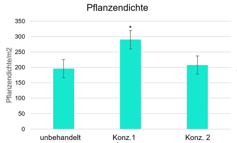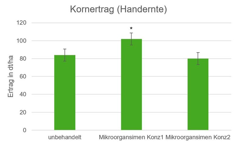 Sowohl bei der Pflanzendichte als auch beim Kornertrag (Handernte) weisen die Parzellen der Mikroorganismenbehandlung 1 (Konz.1) signifikant höhere Werte als die unbehandelten bzw. die mit dem Ansatz 2 behandelten Pflanzen auf (Post-Hoc-Test; α < 0,05). Jedoch gab es durch einen Defekt bei der Drillmaschine eine (nicht mehr nachvollziehbare) Ungenauigkeit in der Ablagetiefe des Saatgutes, so dass die Ergebnisse mit Vorsicht zu betrachten sind.